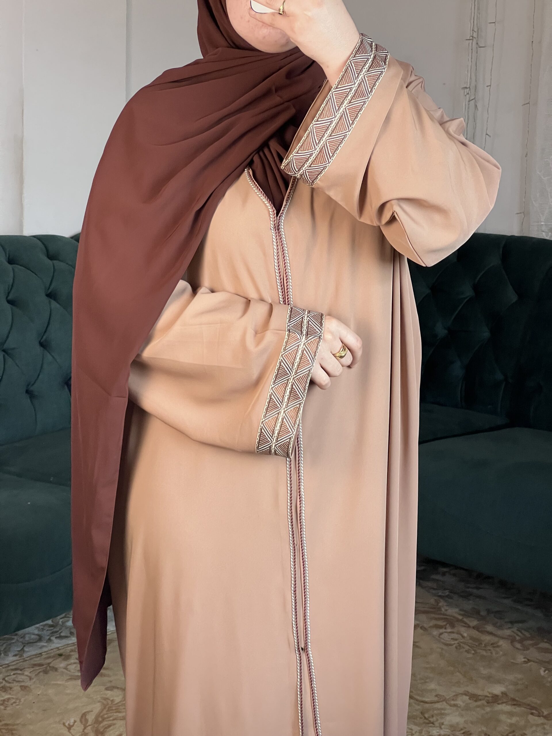عباية أنيقة بتفاصيل مميزة على الأكمام، تصميمها يضفي لمسة من التميز والجمال على إطلالتك. تجمع بين البساطة والفخامة، لتمنحك إطلالة أنثوية راقية تناسب مختلف المناسبات. نوعية القماش تمنحك الراحة والأناقة طوال اليوم، بينما التفاصيل الدقيقة على الأكمام تضيف لمسة من التميز الفريد.