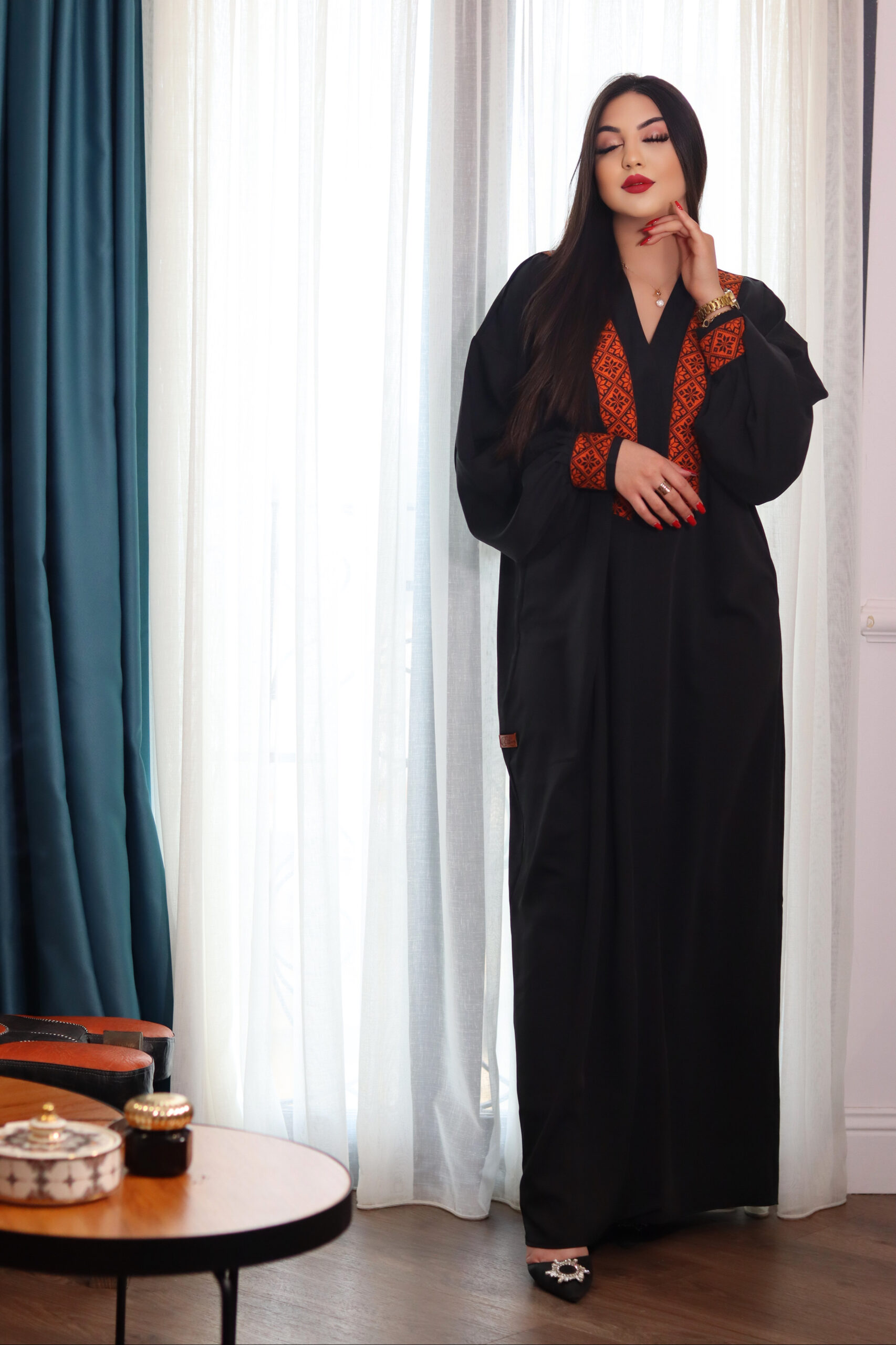 عباءة فلسطين السوداء بتفاصيل برتقالية – لمسة فريدة من الأناقة