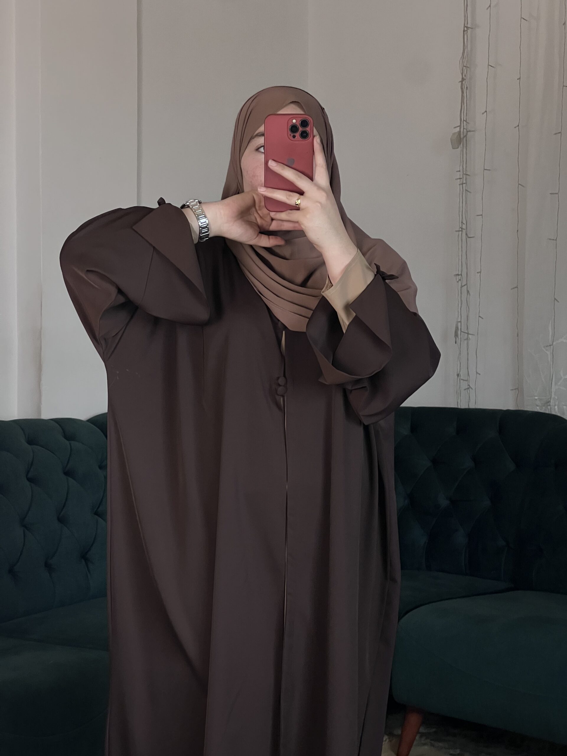 عبايتنا الأنيقة بلونها البني الغني وتصميمها الناعم تضيف لمسة من الفخامة والبساطة في آنٍ واحد. مصنوعة من قماش فاخر ينساب برقي، مع تفاصيل أنيقة على الأكمام لمظهر يعكس الذوق الرفيع. مثالية للإطلالات اليومية والمناسبات الخاصة