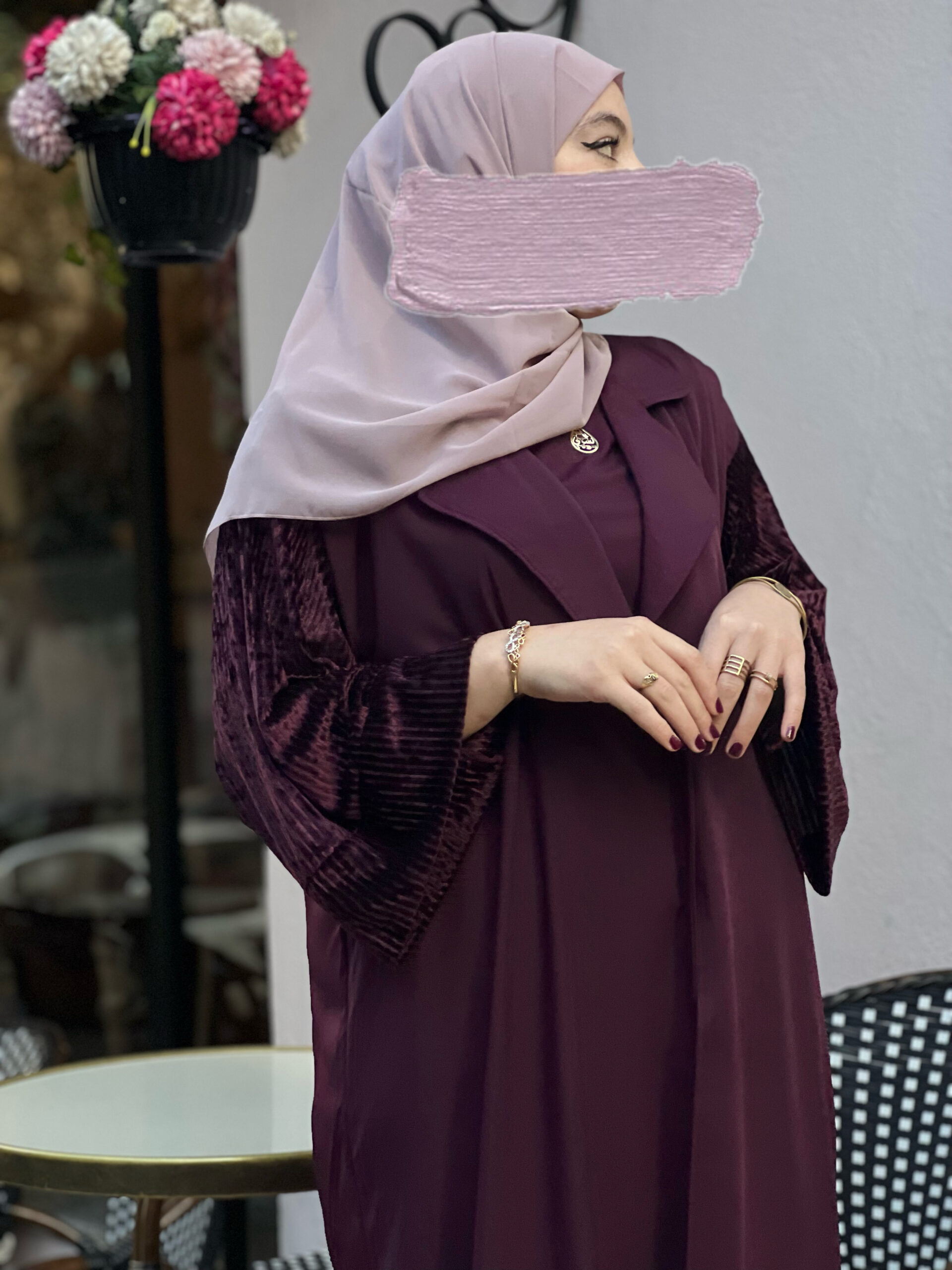 Avec sa coupe classy et ses détails en velours, cette Abaya vous offre un look très chic et élégant, dotée d’un under dress qui vous tient toujours Mastoura, un col tailleur et des manches évasées en velour. Disponible en 3 couleurs et en toutes tailles.